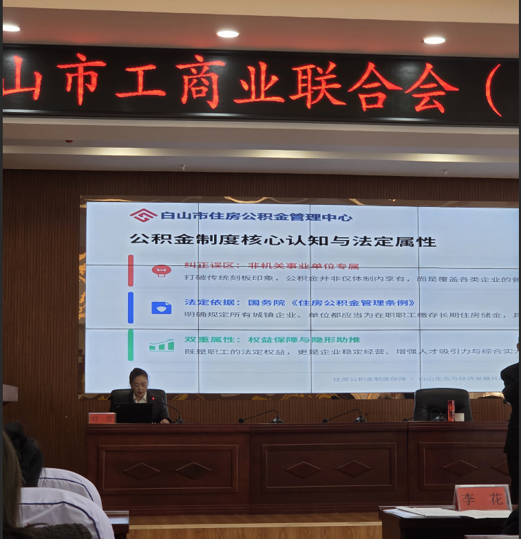 3月26日,应白山市工商业联合会邀请,白山市住房公积金管理中心在市工商联主办的政企交流会上,开展住房公积金惠企政策专题宣讲,旨在打通惠企政策落地“最后一公里”,精准传递政策红利,破除企业认知误区,引导企业依法合规缴存,助力民营企业破解招人留人、成本管控等核心痛点,实现稳岗留才、合规经营与高质量发展共赢。市住房公积金管理中心归集科科长赵蕾主讲,市工商联相关领导、全市各行业民营企业家代表参会。 本次宣讲以“用好公积金 算好三本账 赋能企业稳发展”为主题,聚焦民营企业普遍面临的招人难、留人难、成本管控难三大核心痛点,重点为参会企业算清人才、经济、法律三本核心账,详细解读了住房公积金缴存的政策红利、灵活缴存规则、法定缴存要求,同步发布了白山市2026年最新落地的住房公积金利企便民优化政策,破除企业“缴存公积金就是纯增成本”的认知误区。 赵蕾同志就市住房公积金管理中心惠企服务相关工作,向参会企业作出明确说明。一要精准推送政策红利,牢牢把握公积金“一头连民生、一头连发展”的定位,助力企业破解经营发展痛点;二要强化合规引导,明确公积金缴存的法定义务,引导企业依法合规缴存,规避经营与信用风险;三要优化政务服务质效,深化数据共享,推进“一网通办”,实现公积金开户、缴存等核心业务全程线上办理,提升企业办事便利度。
